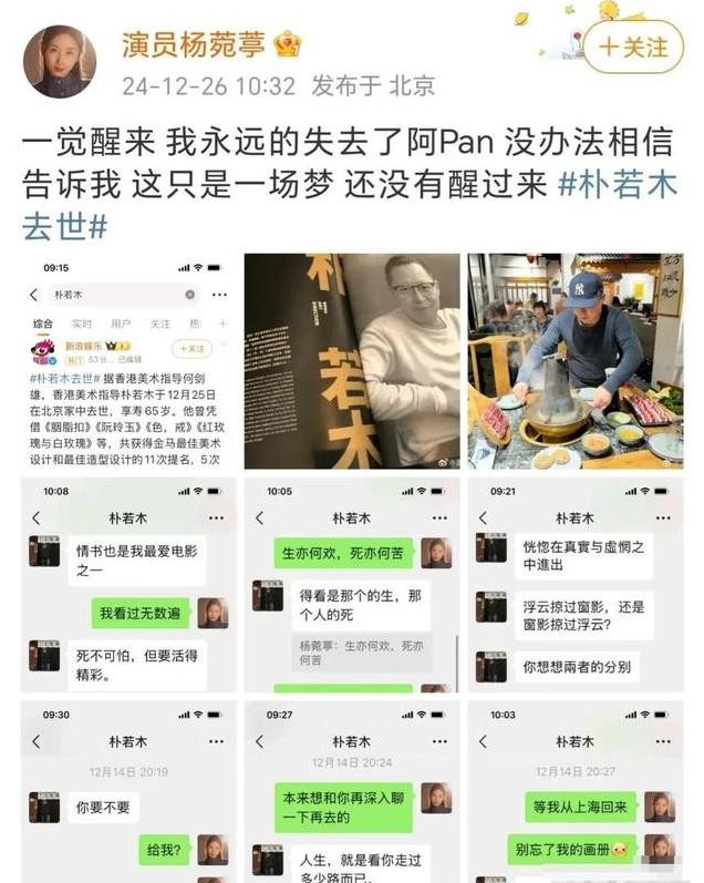 演员杨菀葶在听到这个讯息时,只合计是一场梦,还莫得醒过来。她晒出了与朴若木最近12月14日的聊天记载,聊天中她还找朴若木要一幅画,并让朴若木签名。关系词,画还没拿到,却传来了他升天的死讯。
