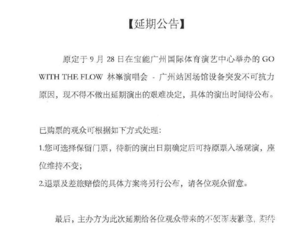 主理方发了公告,暗示场馆建造突发弗成抗力原因,不得不作念出脱期上演的艰难决定。
