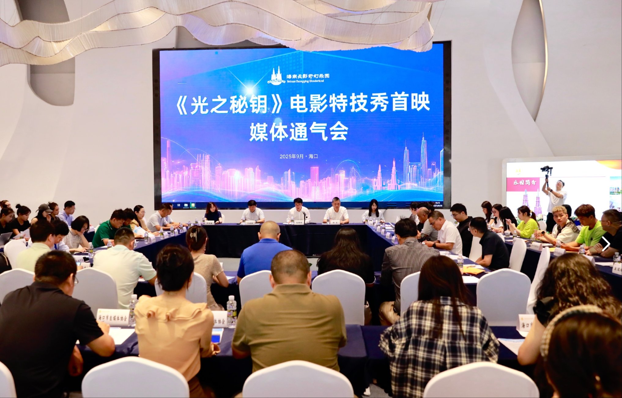 海南长影魔幻乐土《光之秘钥》电影特技秀首映媒体通气会现场。