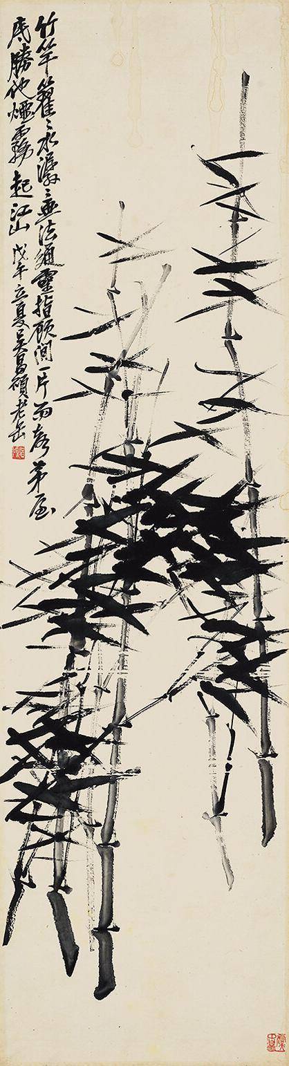 (一)竹竿水籊籊,画法通灵指顾间。一派雨声茅庐底,胜他烟雾起山河。戊午立夏,吴昌硕老缶。