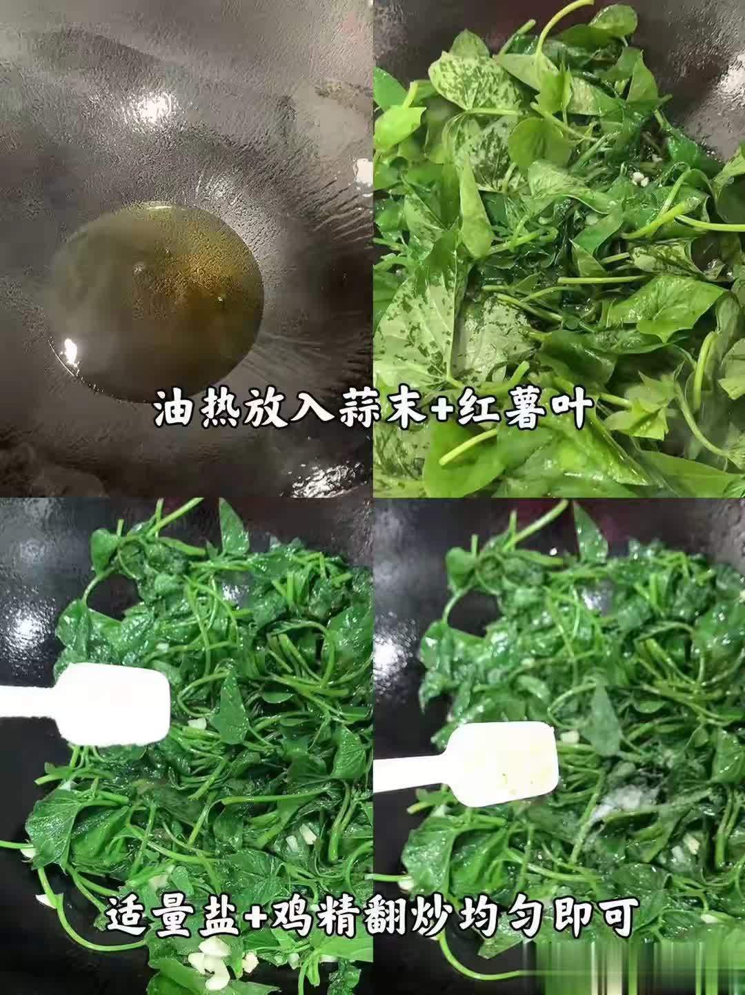 4. 加半勺盐调味,翻炒均匀即可。特质:红薯叶脆嫩,蒜香浓郁,维C含量超高,甲流时间必吃!小妙技:炒时加1勺净水,叶子更嫩绿,养分不流失。