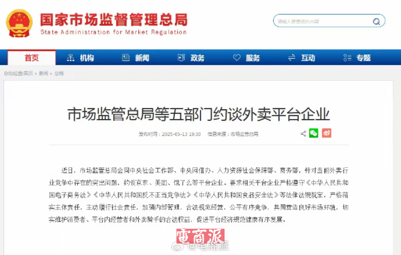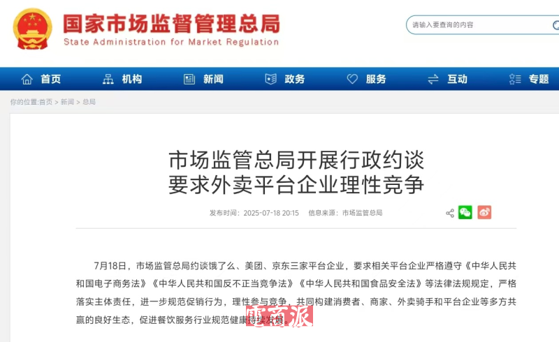 3月25日,国度市集监督料理总局官网转载《经济日报》驳斥著作《外卖大战该收尾了》,一文激起千层浪,激发市集热烈存眷。
