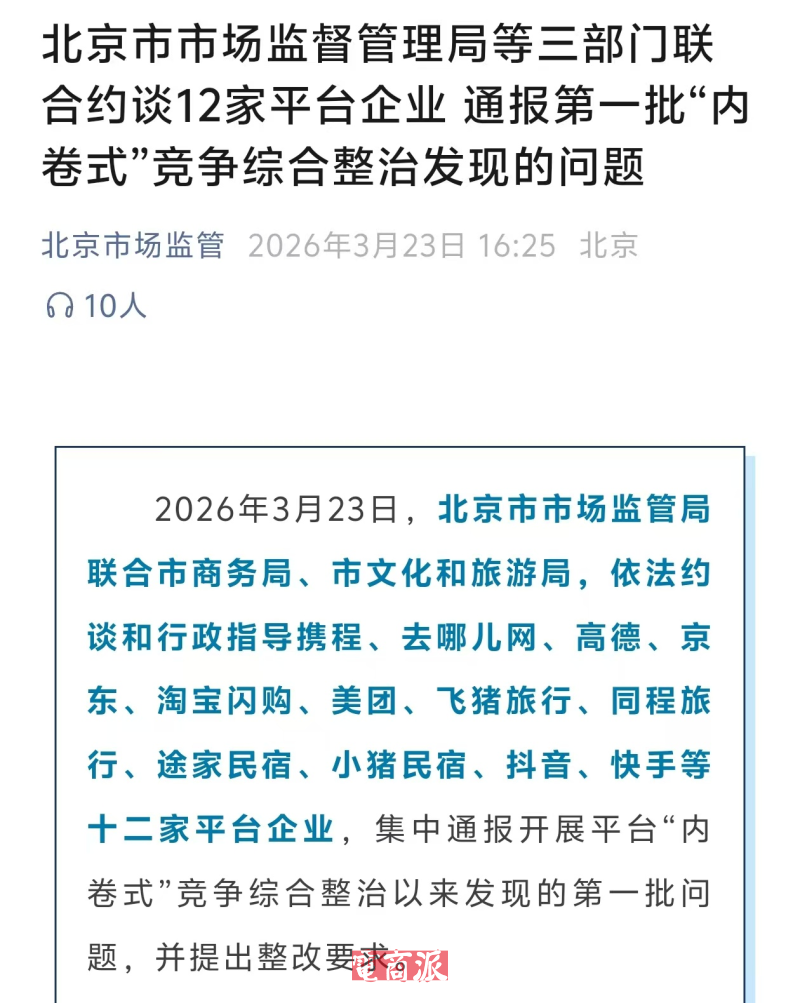 就在3月23日,北京市市集监督料理局等三部门挽救约谈了12家平台企业,通报了第一批“内卷式”竞争轮廓整治中发现的问题,开释出明确的监管信号。