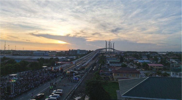 当地时辰10月5日,由中国铁建海外集团有限公司承建的圭亚那巴拉特·贾格迪奥—德梅拉拉河大桥矜重通车。图为通车庆典现场。中国铁建海外集团有限公司供图