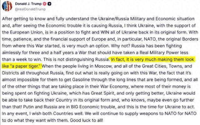 引子 在好意思国总统特朗普的口中,俄罗斯等于只纸老虎! 9月23日,出席聚积国大会的特朗普,在会见完乌克兰总统泽连斯基后,出人意外的在社交账号上抛出一连串的刚劲表态,高调喊着“全力救济乌克兰把国土全夺转头”。 这可把东谈主惊得摸不到头脑,从“劝架的”形成“喊打的”,这招架也太一忽儿了。 况且他还进一步的进行说明注解,在充分的了解到乌克兰和俄罗斯的军事和经济局面后,直言俄罗斯履历了漫无盘算推算的三年半的战争,当今就像是个“纸老虎”。 盟友催着表态,好意思国打着小算盘 特朗普一忽儿变脸,可不是一时兴起,里里外外的成分早就凑皆了。 先看外面的压力,欧洲盟友的游说功不可没。俄乌打了这样久,欧洲早就被耗得够呛,但德国、法国这些国度更怕俄罗斯趁便膨胀,是以一遍遍派高官找特朗普谈,反复强调对乌克兰的救济不行松劲。